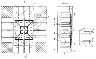 Если необходимую расчетную длину анкеров трудно выдержать из-за температуры, превышающей предельно допустимую температуру применения арматуры, устанавливаемой по расчету (см. табл. 17), то допускается уменьшать длину анкеров с обязательной приваркой к их концам дополни. тельных пластин (черт. 7).