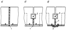 а — шов, заполненный шнуровым асбестом; б — то же, с бетонным бруском; в — то же,