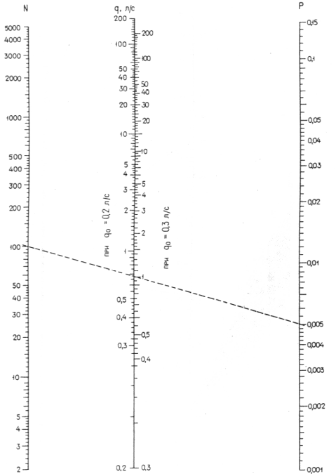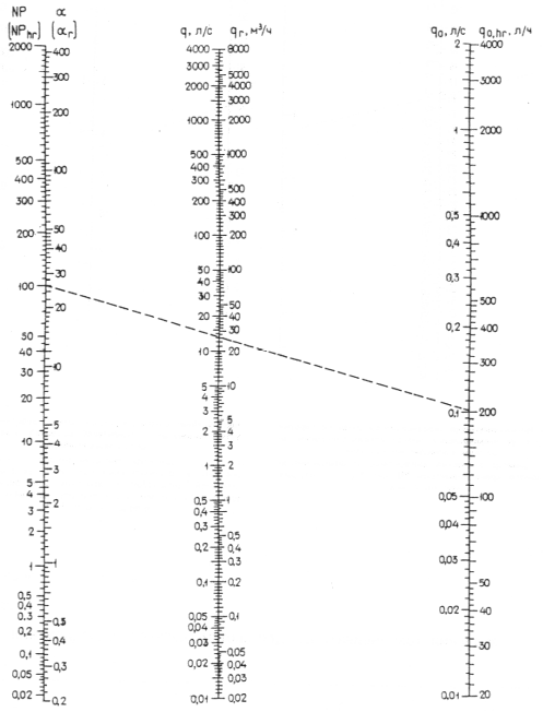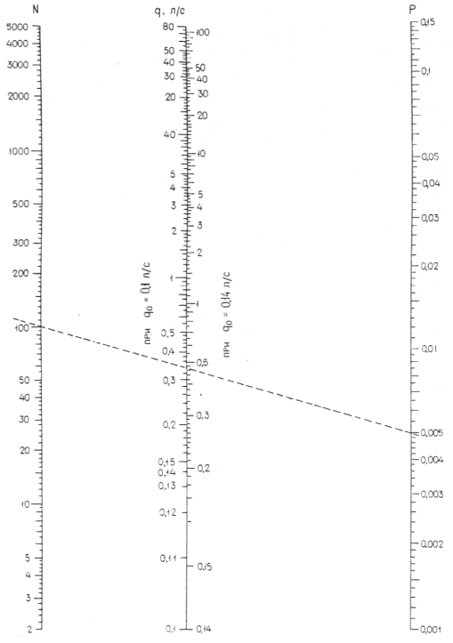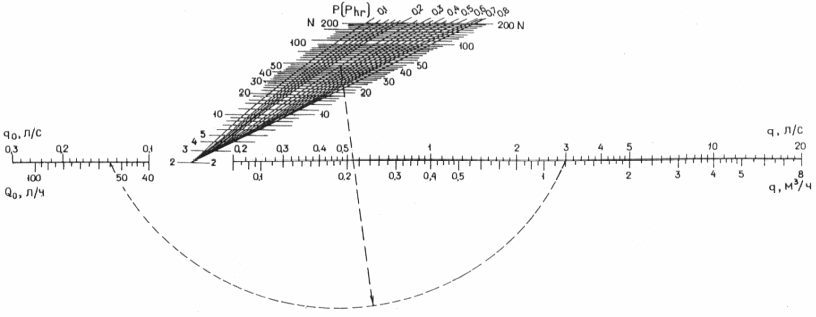 Черт. 3. Номограмма для определения секундных и часовых расходов воды q при q0 £ 0,3 л/с, N £ 200 и Р > 0,1