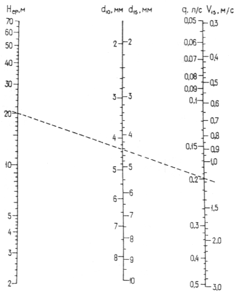 Черт. 6. Номограмма для определения отверстий диафрагм, устанавливаемых