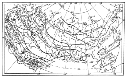 Черт. 3. Климатические коэффициенты для определения величины нагрузки на иловые площадки (сплошные и пунктирные линии) и продолжительности периода намораживания на иловых площадках,