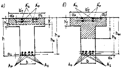 а — при расположении границы сжатой зоны в плите; б — то же, в ребре