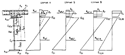 sbi, sri — уравновешенные в поперечном сталежелезобетонном сечении напряжения, возникающие на уровне центра тяжести поперечного сечения бетона от его ползучести, обжатия поперечных швов сборной плиты, усадки бетона и изменений температуры (за исключением случая, когда температура железобетонной плиты согласно п. 5.10,г выше, чем стали, и расчеты проводятся по формулам табл. 93*—95) соответственно в бетоне и в продольной арматуре;