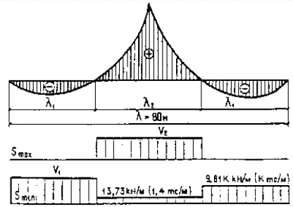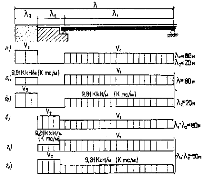Коэффициент надежности по нагрузке следует принимать, руководствуясь приведенной длиной загружения, равной сумме длин участков, на которых в каждом случае размещается временная нагрузка.