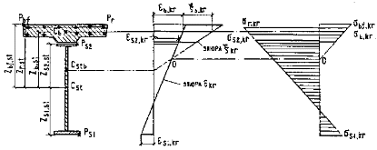 Для конструкции, состоящей из стальной балки со сплошной стенкой и объединенной с ней в уровне проезда железобетонной плиты (см. чертеж), внутренние напряжения от ползучести бетона в общем случае надлежит определять по следующим формулам: