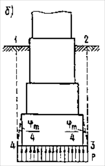 Несущую способность основания условного фундамента проверяют согласно п. 7.8*, при этом подлежащие проверке среднее р, кПа (тс/м2), и максимальное рmax, кПа (тс/м2), давления на грунт в сечении 3—4 по подошве условного фундамента (см. черт. 1—5) следует определять по формулам: