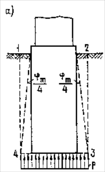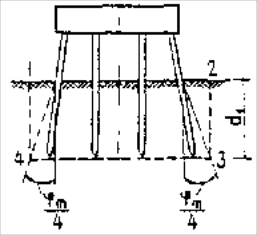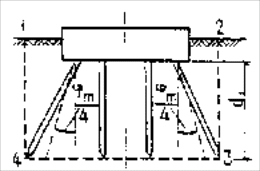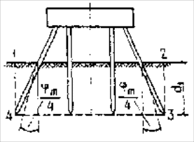 где Nc — нормальная составляющая давления условного фундамента на грунт основания, кН (тc), определяемая с учетом веса грунтового массива 1—2—3—4 вместе с заключенными в нем ростверком и сваями или опускным колодцем;
