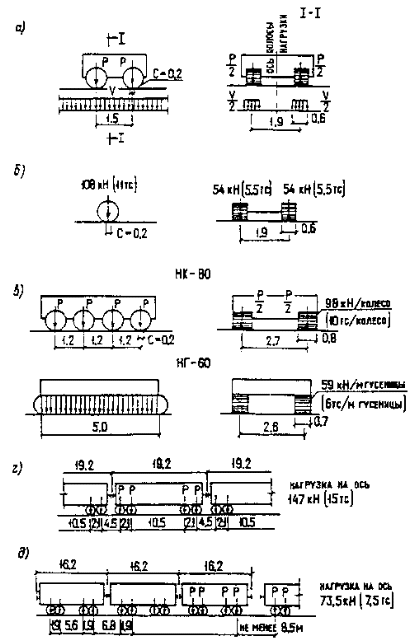 а — автомобильная нагрузка АК в виде полосы равномерно распределенной нагрузки интенсивностью n и одиночной тележки с давлением на ось Р; б — одиночная ось для проверки проезжей части мостов, проектируемых под нагрузку А-8; в — тяжелые одиночные нагрузки НК-80, НГ-60; г — поезда метрополитена; д — поезда трамвая