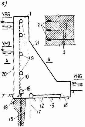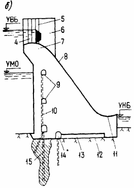 а — глухая плотина, б — водосливная плотина; 1 — гребень; 2 — противофильтрационные уплотнения; 3 — температурные швы; 4 —паз ремонтного заграждения; 5 — паз рабочего затвора; 6 — промежуточный бык водосливной плотины; 7 — гребень водослива; 8 —водосливная грань; 9— смотровые галереи; 10 — дрены тела плотины; 11 —носок-трамплин; 12 —подошва; 13 — разгрузочная полость; 14* — дренажная галерея; 15 — противофильтрационная (обычно цементационная) завеса; 16 — низовой клин; 17 — дренажные скважины основания; 18 — верховой клин; 19* — цементационная галерея; 20 — напорная грань; 21 ‑ низовая грань