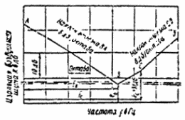 Примечание. Построение частотной характеристики изоляции воздушного шума производится следующим образом: из точки В влево проводится горизонтальный отрезок АВ, а от точки В вправо проводится отрезок ВС с наклоном 7,5 дБ на октаву до точки С с ординатой