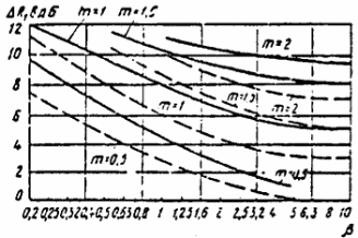 Рис. 12. График для определения повышения изоляции воздушного шума стеной при устройстве плит (сухой штукатурки, древесноволокнистых плит и т.п.) на относе с обеих сторон стены