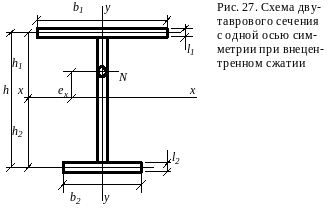 – эксцентриситет приложения сжимающей силы относительно оси х–х, принимаемый со своим знаком (на рис. 27 ex показан со знаком "плюс");