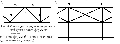 | Обозначения, принятые в таблице 12 (рис. 7, д): l – расстояние от центра узла фермы до пересечения элементов; l1 – полная геометрическая длина элемента. | |||