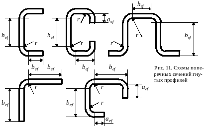 hef – расчетная высота стенки (рис. 10), равная в сварных балках полной высоте стенки, в балках с поясными соединениями на высокопрочных болтах – расстоянию между ближайшими к оси балки краями поясных уголков, в балках, составленных из прокатных профилей, – расстоянию между началами внутренних закруглений, в гнутых профилях (рис. 11) – расстоянию между краями выкружек;