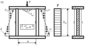 В отсеках, где сосредоточенная нагрузка приложена к растянутому поясу, одновременно должны быть учтены только два компонента напряженного состояния: s и t или sloc и t.