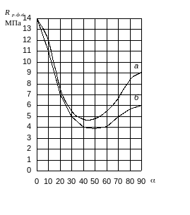 Рис. 17. Графики для определения расчетных сопротивлений при растяжений под углом к волокнам наружных слоев березовой фанеры марки ФСФ