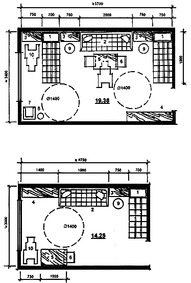 Новое - это сокращение вместимости спальных комнат для детей-инвалидов (2-4 места), а также возможность предусматривать санитарные узлы при каждой спальной комнате. На рис. 4.6 - 4.8 приводятся примеры проектирования спальных комнат, а на рис.4.9 - санитарных узлов при них с учетом потребностей инвалидов-колясочников. При разработке планировочных схем спальных комнат должна преследоваться цель создания уютной, семейной обстановки жилой комнаты.