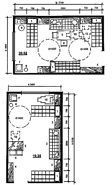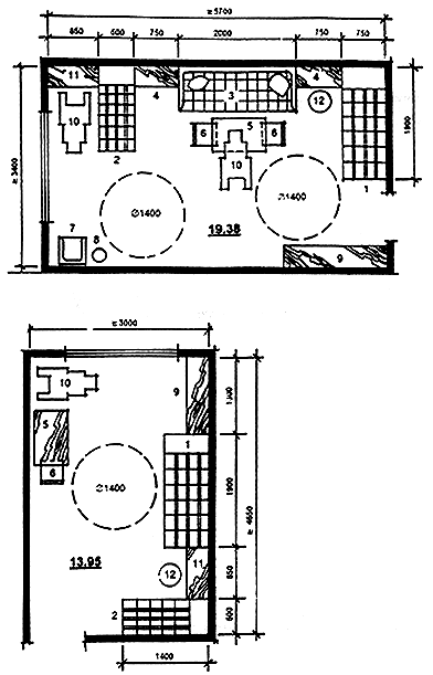 На рис. 4.13 приводятся примеры возможной планировки общей комнаты-столовой и кухни, а также комнаты для игр и учебных занятий при квартирном типе проживания в домах-интернатах.