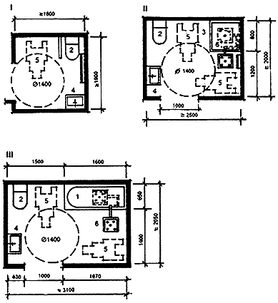 Возможность обслуживания инвалидов-колясочников предопределяет особенности организации (планировочной) санитарных узлов для дошкольников. Необходимость предусматривать проходы, развороты для колясок, возможность подхода колясочников к санитарным приборам, устройства поворотного кресла при душевой - главные условия проектирования туалетных для дошкольных групп (рис. 4.4).