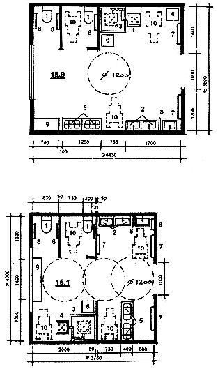 Жилые помещения, проектируемые по принципу детского сада, -наиболее традиционный тип жилья для дошкольников. До сих пор этот тип жилья проектировался без учета потребностей инвалидов-колясочников, которые требуют особых условий. В предлагаемых на рис. 4.1-4.3 планировочных схемах предусмотрены необходимые габариты проходов, возможности разворотов и др. При этом размер разворотного круга принимается для детей-дошкольников - 1,2 м.