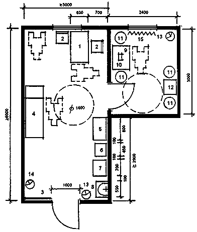 На рис. 6.1-6.12 и 6.15-6.21 приведены примеры планировочных решений лечебно-процедурных кабинетов с учетом обслуживания инвалидов-колясочников, а также применения специального оборудования и устройств для их перемещения.