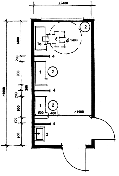 На рис. 6.22 разработаны примеры планировки мельцеровских боксов на 1 и 2 места с учетом обслуживания инвалидов-колясочников и возможностью эвакуации больного на насилках.