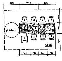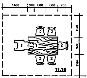 Если принять расчетное число посадок = 3, то единовременная вместимость обеденного зала составит: 36 : 3 = 12 мест. Тогда площадь обеденного зала составит: 1,8 м