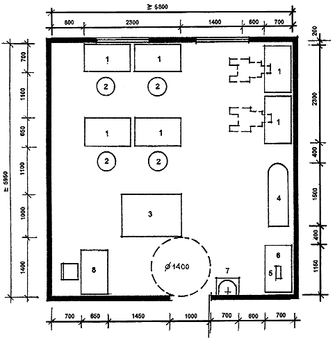 Планировочные схемы всех медицинских кабинетов, за исключением кабинетов, предназначенных только для слепых и слабовидящих детей, разработаны с учетом обслуживания инвалидов-колясочников. При этом для кабинетов, обслуживающих только дошкольников, необходимые размеры поворотного круга для инвалидов-колясочников приняты - 1,2 м; для кабинетов, которые предназначены для всех возрастов детей - 1,4 м.