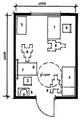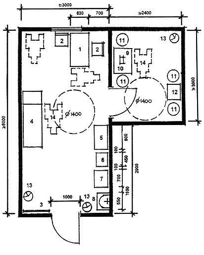 Примеры планировки даны для специфических помещений медицинского обслуживания инвалидов. Остальные помещения проектируются по действующим нормативам для лечебно-профилактических учреждений.