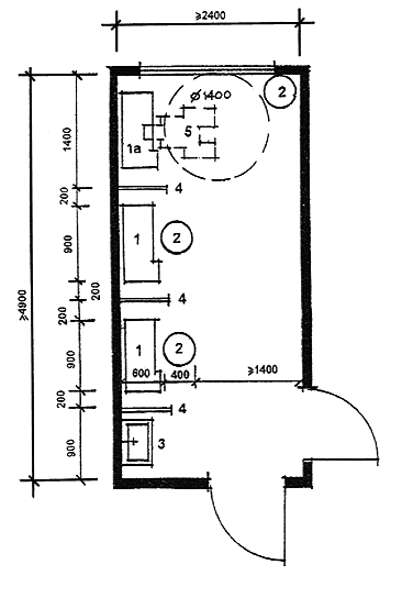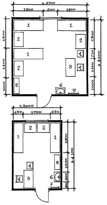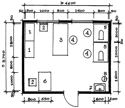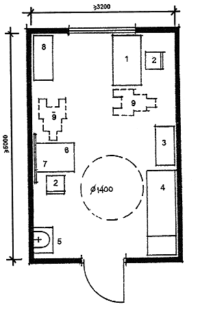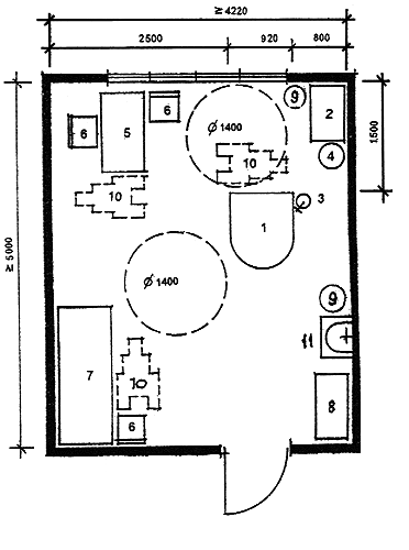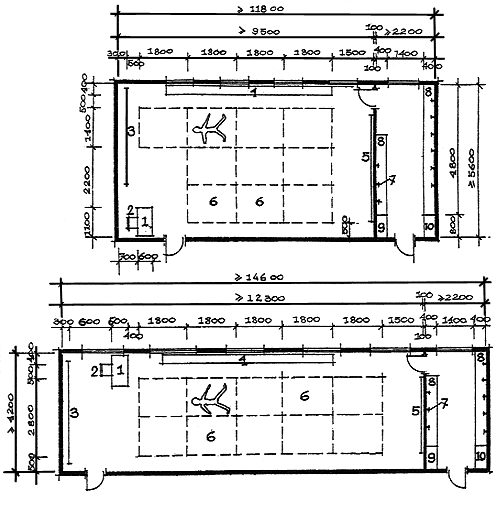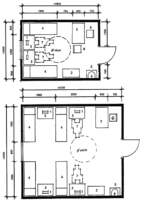 Рис. 6.26. Примеры планировки кабинета рефлексотерапии на 3 и на 2 кушетки