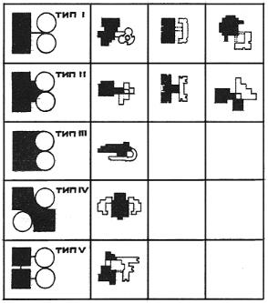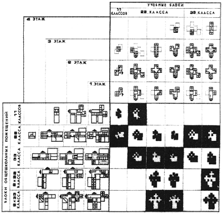 Рисунок 4. ВАРИАНТЫ КОМПОЗИЦИОННЫХ РЕШЕНИЙ ШКОЛ С ВЫДЕЛЕННЫМИ БЛОКАМИ ОБЩЕШКОЛЬНЫХ ПОМЕЩЕНИЙ ДЛЯ УЧАЩИХСЯ И НАСЕЛЕНИЯ (по материалам конкурса)