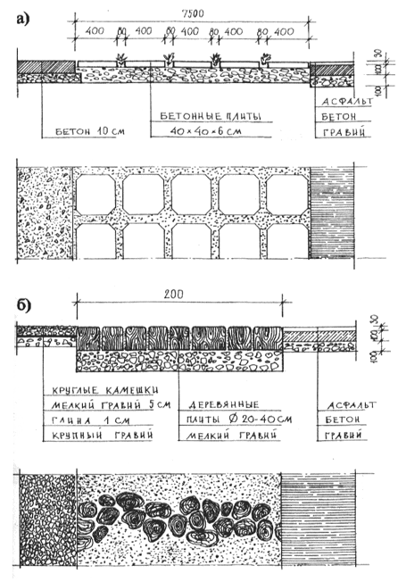 а - с применением бетонной тротуарной плитки; б - деревянное