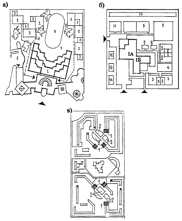 б - при УВК: 1А - школьное отделение; 1Б - дошкольное отделение; 2 - теневой навес; 3 - групповая площадка; 4 - физкультурная площадка дошкольного отделения; 5 - площадка для животных и птиц; 6 - огород-ягодник; 7 - хозплощадка; 8 - площадка для двухкомандных игр; 9 - гимнастическая площадка; 10 - беговая дорожка; 11 - площадка для отдыха; 12 - участок плодового сада; 13 - участок овощных и плодовых культур; 14 - метеорологическая и геологическая площадка;