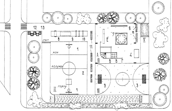 I - беговая дорожка; II - спортивная площадка для игр в волейбол, бадминтон, баскетбол, городки; III - зеленая лужайка для подвижных игр с элементами соревнования; IV - зона с гимнастическим оборудованием и спортивными снарядами; V - яма для прыжков в длину и высоту; VI - полоса препятствий