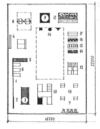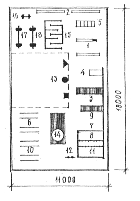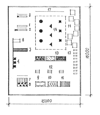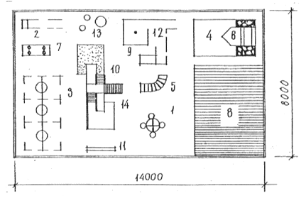 1- карусель; 2 - кольцеброс; 3 - качели шинные; 4 - песочница; 5 - система обручей для пролезания; 6 - макет корабля; 7 - качалки на пружинах; 8 - теневой навес; 9 - доска с планочками; 10 - односкатная горка; 11 - скамья; 12 - одноярусный лабиринт алфавитный; 13 - вкопанные шины; 14 - наклонная лестница