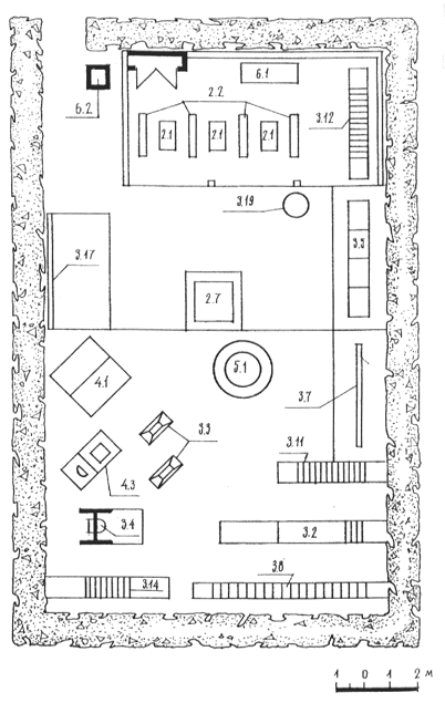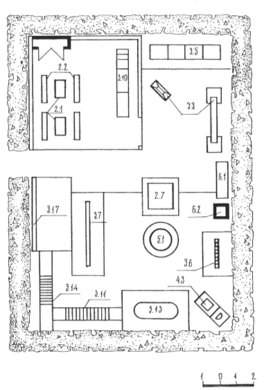 2.1 - столик для игр; 2.2 - скамья со спинкой для детей; 2.7 - песочница; 3.3 - качели; 3.5 - оборудование для профилактики плоскостопия; 3.6 - столбики; 3.7 - балансир; 3.10 - лесенки-ступеньки; 3.11 - лестница наклонная; 3.13 - гимнастическая лестница; 3.14 - оборудование для лазания и игр с мячом; 3.17 - игровая стенка; 4.3 - автомобиль; 5.1 - чаша с водой; 6.1 - скамья для взрослых; 6.2 - цветочница