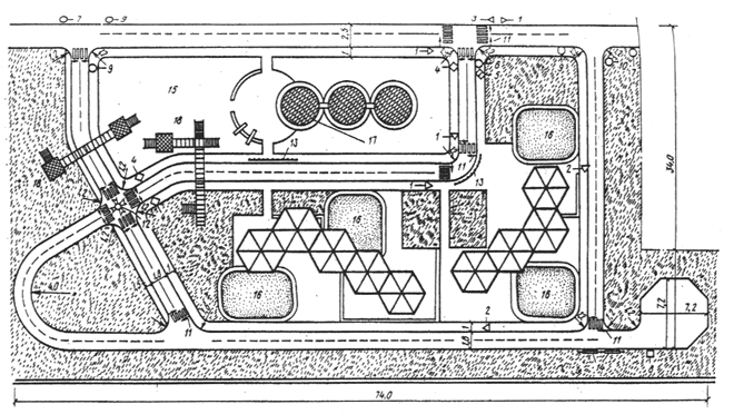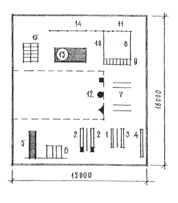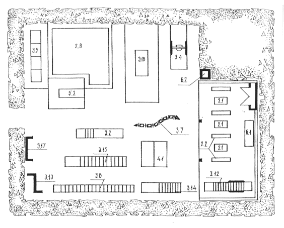 1 - здание ДУ; 2 - групповые площадки ясельных групп; 3 - групповые площадки детей 3-6 (7) лет; 4 - теневой навес; 5 - общая физкультурная площадка; 6 - специализированные площадки; 7 - плескательный бассейн; 8 - огород-ягодник; 9 - площадка для домашних животных и птиц; 10 - хозплощадка (мусоросборники); 11 - место для стоянки личных автомобилей персонала; 12 - место ожидания родителями детей; 13 - кольцевая велосипедная дорожка; 14 - кольцевой автомобильный проезд; 15 - озеленение