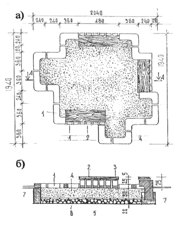 5 -кирпич; 6 -песок, глина; 7 -бетон