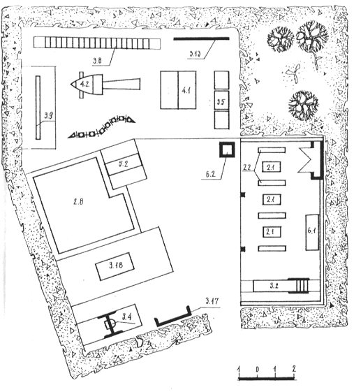 2.1 (здесь и далее цифровые обозначения даны в соответствии с Приложением 3 к Рекомендациям по размещению, планировке и оборудованию участков дошкольных учреждений. М., ЦНИИЭП учебных зданий, 1984 г.) - столик для игр; 2.2 - скамья со спинкой для детей; 2.3 - манеж; 2.4 - столик-барьер; 2.5 - барьер; 2.6 - песочница-столик; 3.1 - горка-манеж; 3.5 - оборудование для профилактики плоскостопия; 3.10 - лесенки-ступеньки; 3.19 - корзина для забрасывания мяча; 4.4 - пароход; 6.1 - скамья для взрослых; 6.2 - цветочница