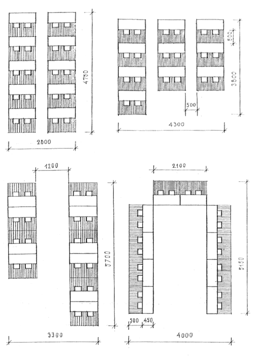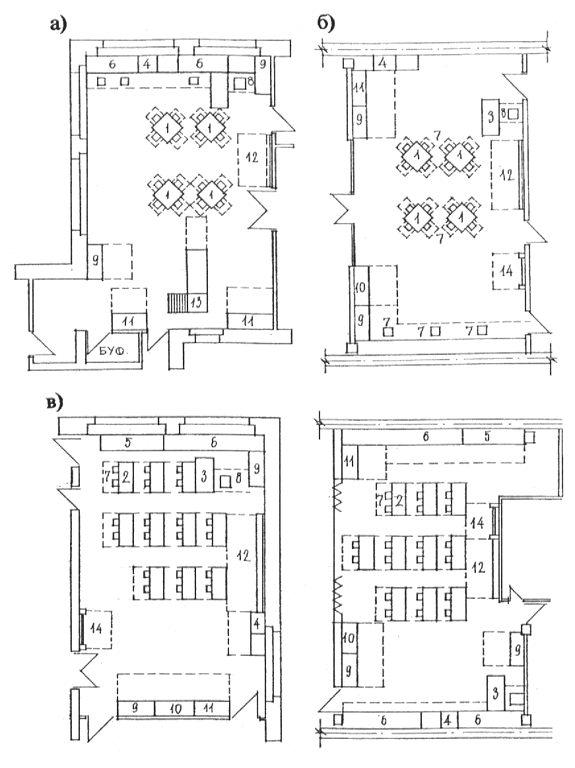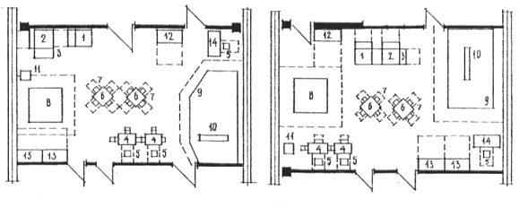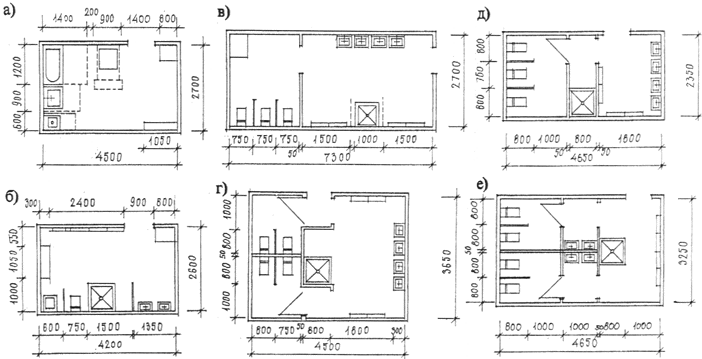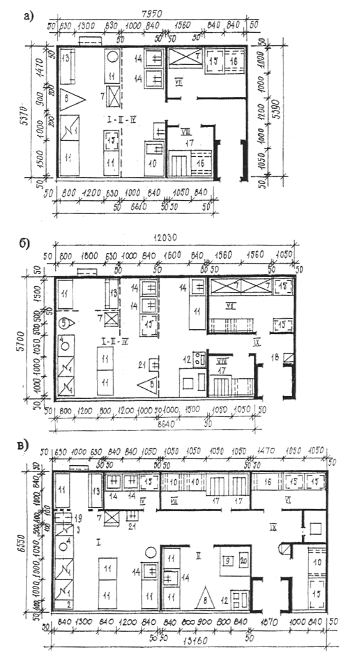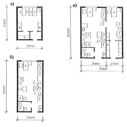 Рис. 43 Примеры планировки и оборудования пищеблоков: