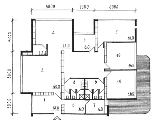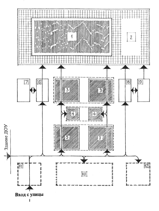 1 - раздевальная; 2 - игровая; 3 - комната воспитателя; 4 - столовая; 5 - класс; 6 - сушильная; 7 - кладовая; 8 - туалетная; 9 - буфетная; 10 - спальня; 11 - веранда