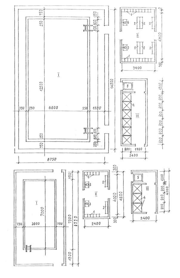 Рис. 41 Примеры планировки и оборудования помещений бассейна с ванной размером: