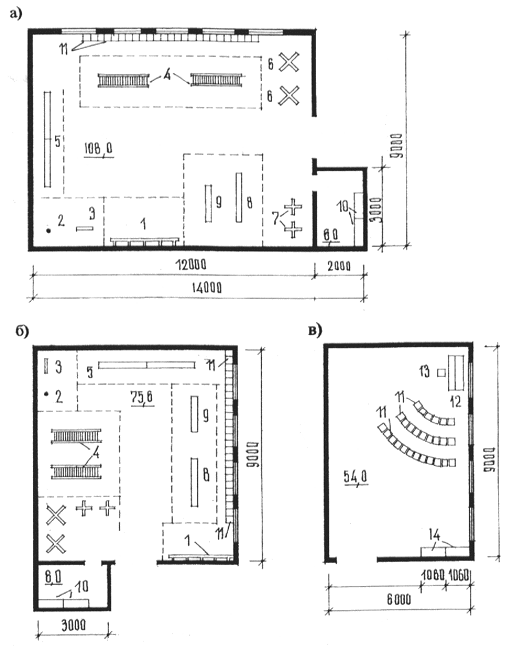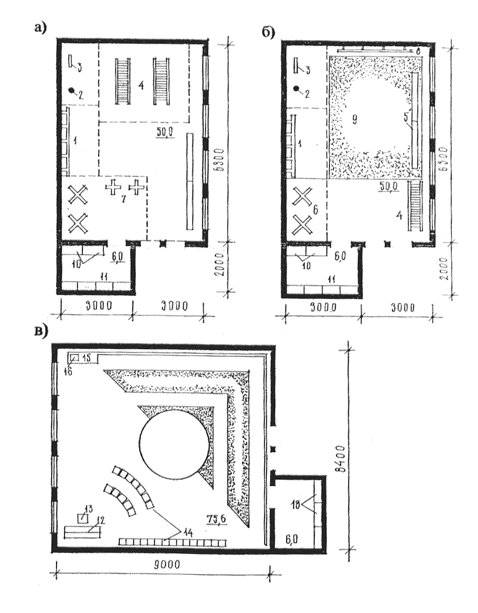 а - кабинет тифлопедагога; б - плеопто-ортоптическая комната; в - плеопто-ортоптическая комната, совмещенная с кабинетом окулиста