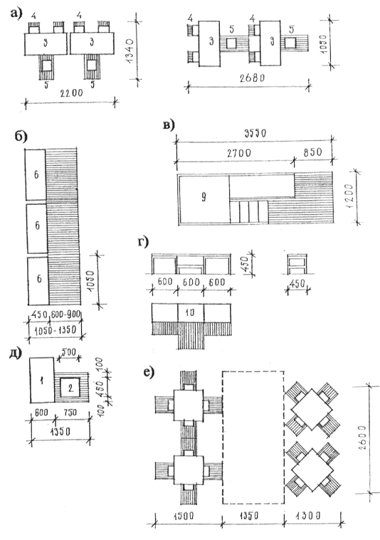 а - оздоровительной группы детей возраста до 3 лет; б - разновозрастной группы детей возраста до 3 лет; в - одновозрастной группы детей возраста 3-6 (7) лет; г - разновозрастной группы детей возраста 3-6 (7) лет; д - групповой ячейки группы "шестилеток" (с классным помещением); е - малокомплектной группы "семейный детский сад"; ж - прогулочных групп;