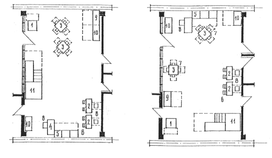 Рис. 29 Разные приемы организации "зоны столиков" в групповых детей 3-6 (7) лет во время еды и занятий, для которых данная организация пространства является желательной
