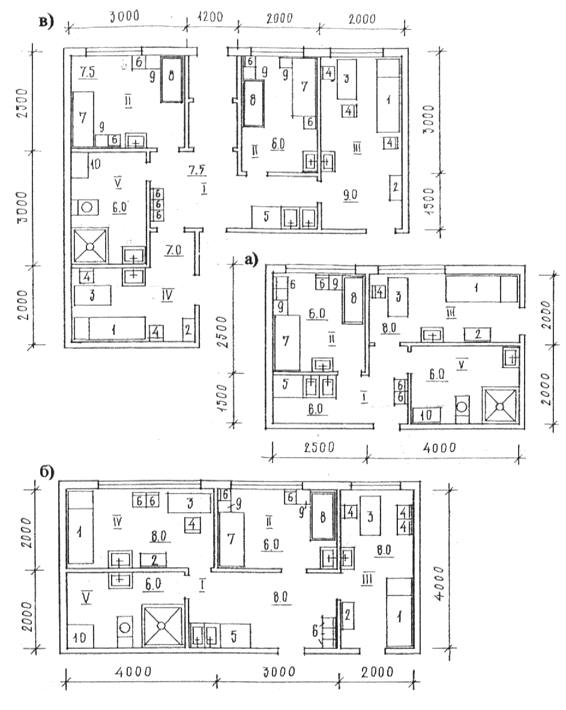 с индивидуальными кроватками; б - со встроенными откидными кроватками; в - размещение в одном помещении площадью 36-40