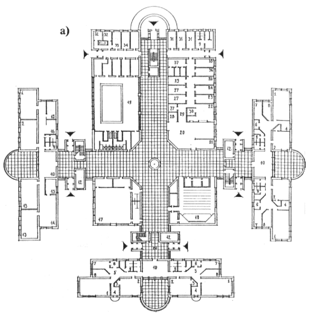 1 - раздевальная; 2 - групповая; 3 - спальня; 4 - туалетная; 5 - класс; 6 - логопедический кабинет; 7 - кабинет врача-специалиста; 8 - массажный кабинет; 9 - физиотерапевтический кабинет; 10 - процедурная; 11 - изолятор; 12 - хозпомещения; 13 - пищеблок; 14 - постирочная; 15 - универсальный зал; 16 - кабинет заведующего
