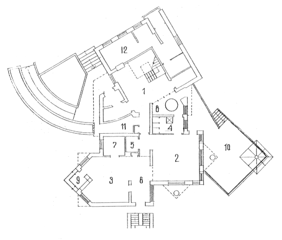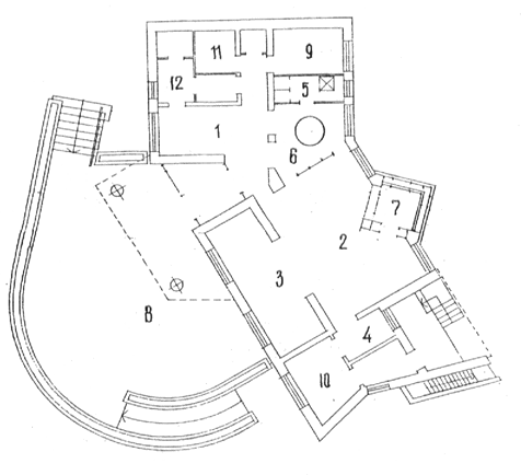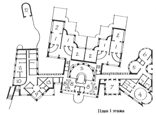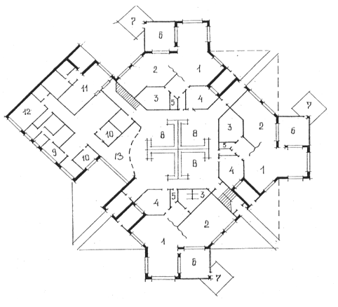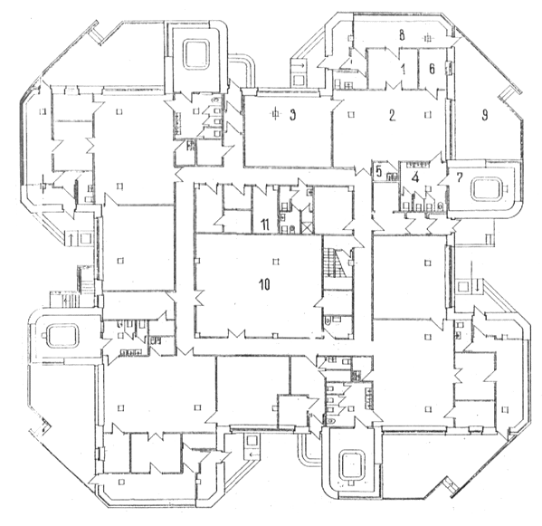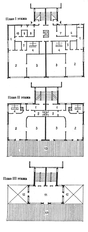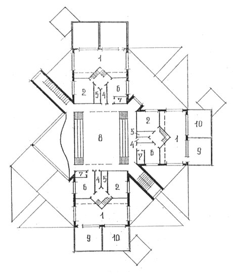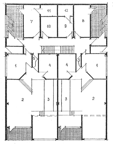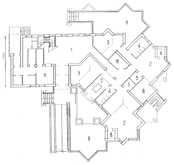 1 - раздевальная; 2 - групповая; 3 - спальня; 4 - туалетная; 5 - буфетная; 6 - помещение для занятий по подгруппам; 7 - ванна-бассейн; 8 - остекленная веранда; 9 - открытая терраса; 10 - зал для музыкальных и гимнастических занятий; 11 - служебно-бытовые помещения