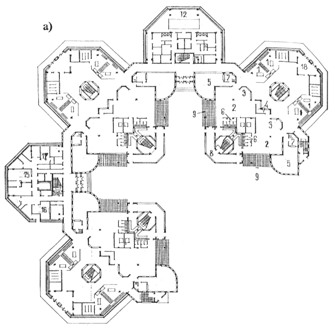 1 - раздевальная; 2 - групповая; 3 - "домашний уголок"; 4 - буфетная; 5 - спальня; 6 - туалетная; 7 - комната персонала; 8 - остекленная веранда; 9 - открытая терраса; 10 - зал для гимнастических занятий; 11 - зал-арена; 12 - бассейн с ванной 12,6х6 м; 13 - терраса-солярий; 14 - медицинские помещения; 15 - пищеблок; 16 - постирочная; 17 - служебно-бытовые помещения; 18 - тамбур-шлюз