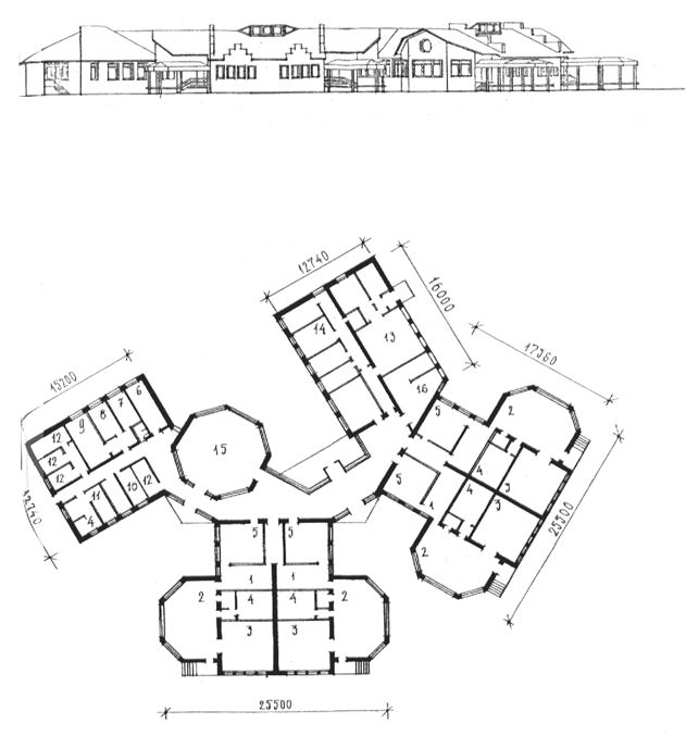 Рис. 59 Учебно-воспитательный комплекс на 6 групп и 4 начальных класса. Арх. Щербакова (ГИПРОПРОС)